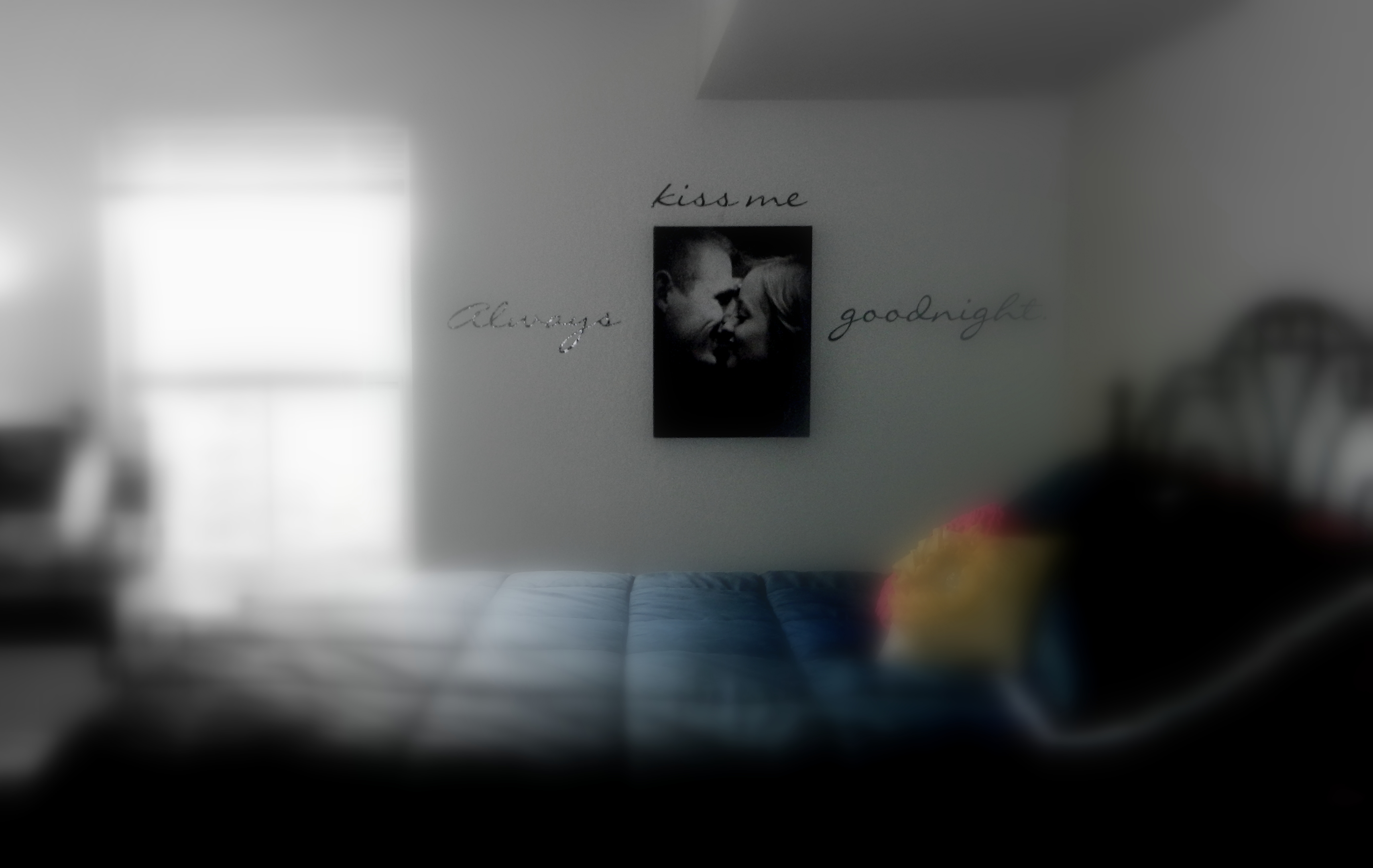 ImageLaying in my bed a few weeks ago, I took a moment to rest amidst a busy Saturday of cleaning and cooking. Letting my body slowly sink into the memory foam, I breathed out deeply and allowed my eyes to start wondering around the room.  I saw the furniture my parents gave to Andrew and I from my childhood room, I saw stacks of boxes waiting for me to dig into them, (do these ever end)?, I saw a vanity that really needed to be dusted, and then my eyes stopped.  All of the sudden I realized I had been staring at one thing for over a minute; a large canvas picture of Andrew and I that is hanging on the wall next to our bed.   On it is an engagement picture in which we are almost kissing; leaning intimately into each other and we each have on our face a very soft, tender smile.  Around the picture on the wall are the words “Always Kiss Me Goodnight.”  We have made this saying our rule and have followed it every night before bed no matter how tired we are.  As I thought of that sweet commitment, I smiled, but then my gaze became hazier and my mind started to drift as I looked away from myself in the picture to my husband.